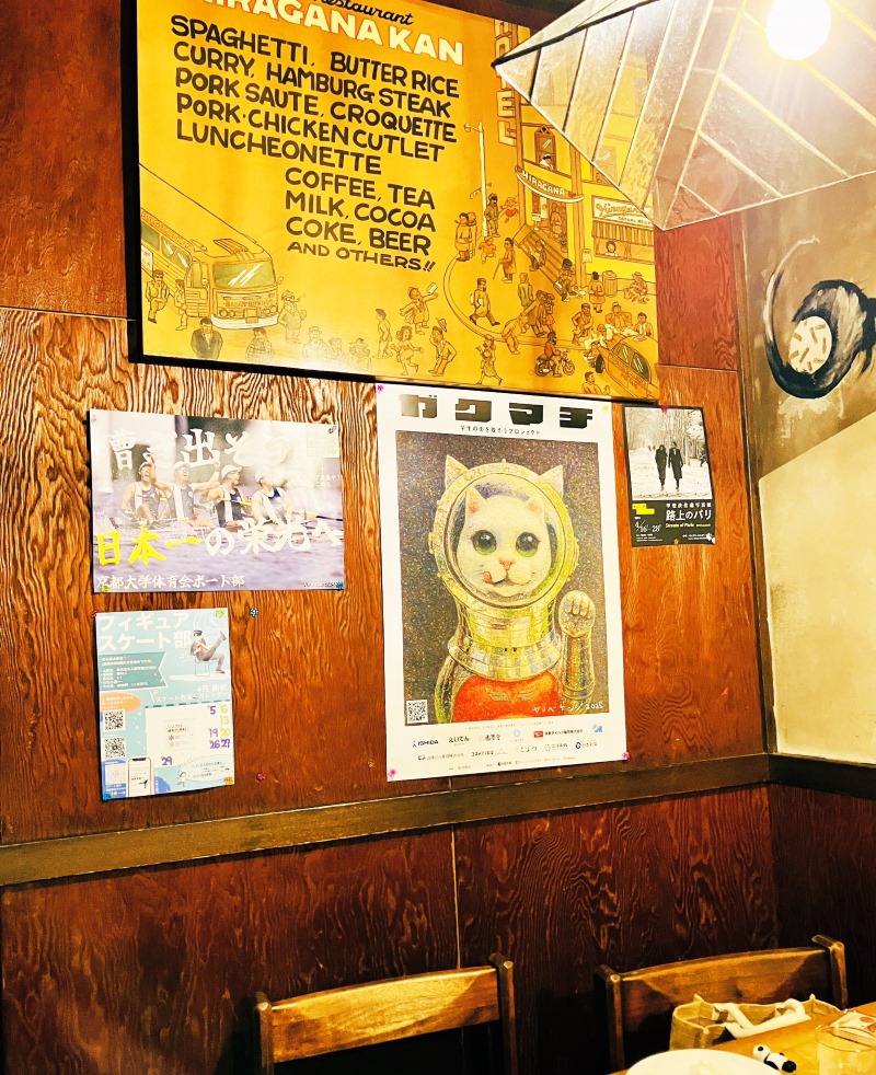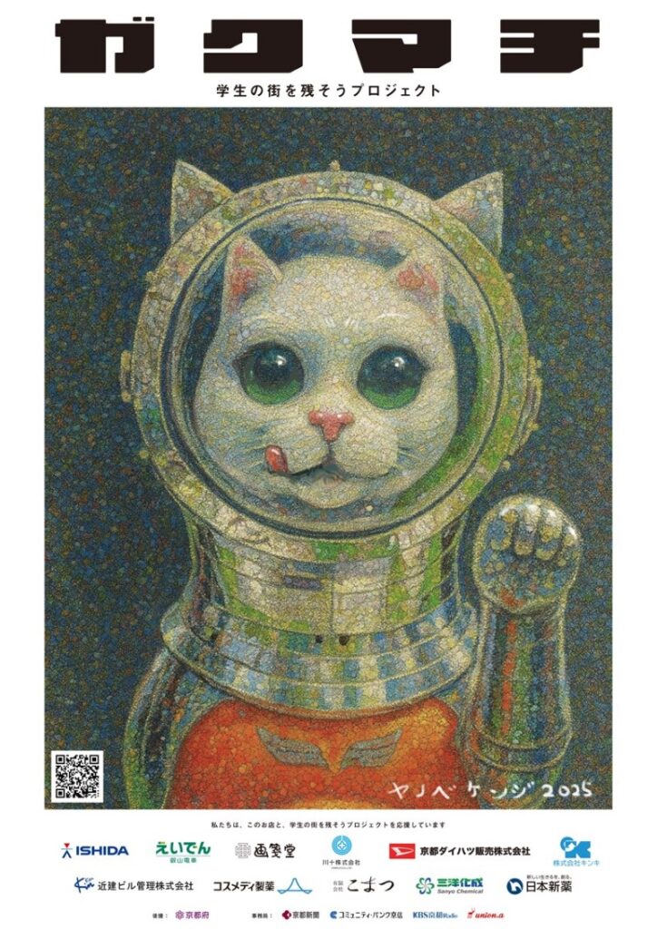 プロジェクトのスタートは、京都大学・同志社大学・立命館大学・京都芸術大学の4つの大学エリアを対象に、各大学100名の学生にアンケートを実施。学生たちに「いつもよく行く好きなお店、なくなってほしくないお店 」を「ガクマチ店舗」として3店舗を決定。2025年10月1日(水)より、現代美術家・ヤノベケンジさんが描いた《SHIP’S CAT》が登場する協賛応援ポスターとステッカーが計12店舗に掲示されています。協賛金の一部は店舗の経営維持や、利用する学生を対象とする「お得なサービス」などに活用していただくため、「ガクマチ店舗」へ寄付します。